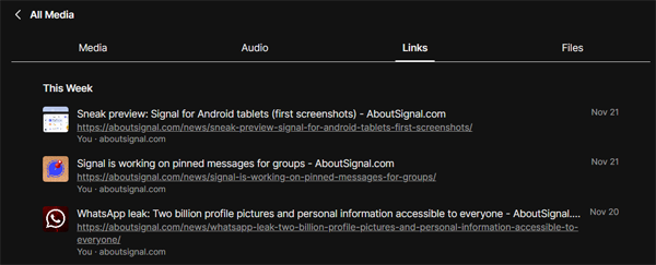 Mit dieser neuen Medienübersicht bietet Signal Desktop eine übersichtlichere Möglichkeit, geteilte Inhalte schnell zu finden.