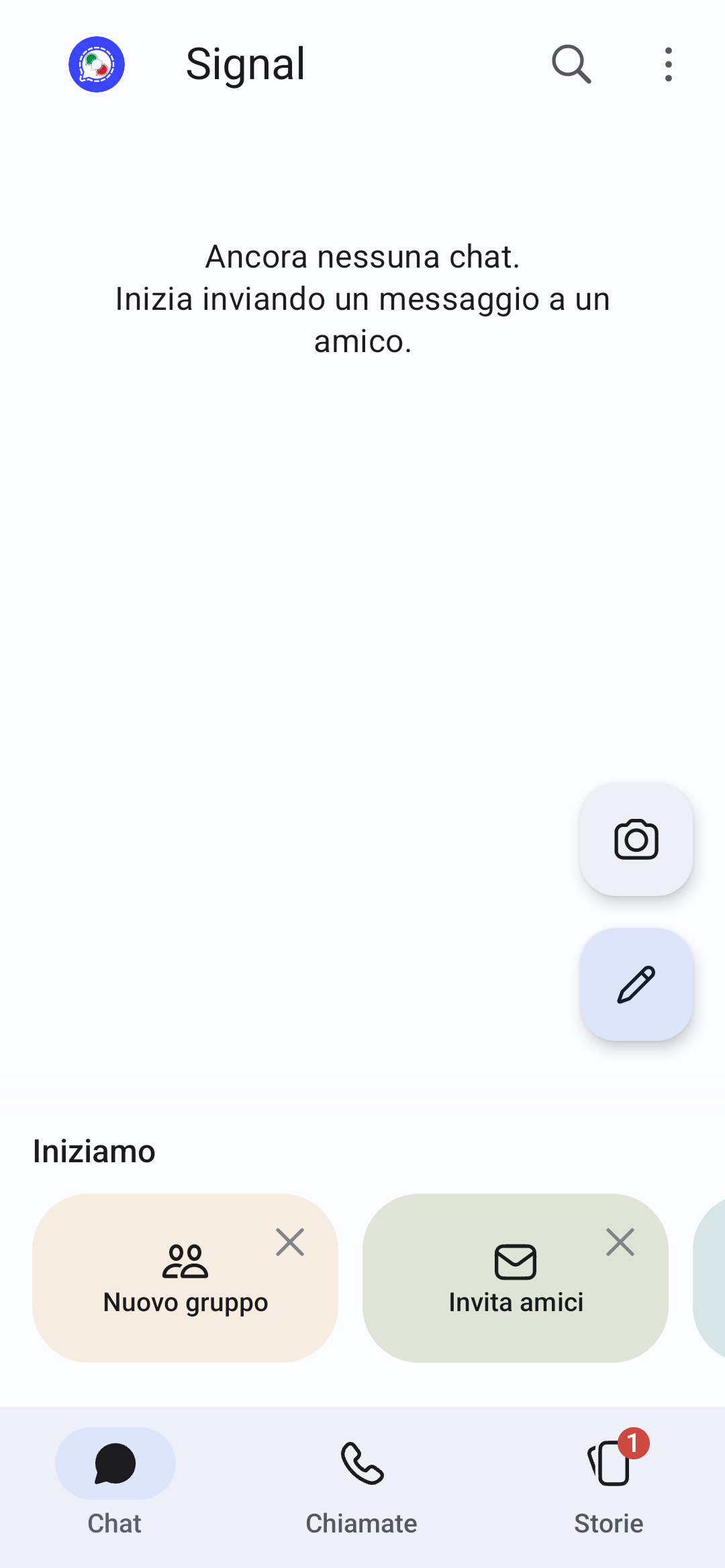 Quando apri Signal per la prima volta, vedrai alcuni suggerimenti utili nella parte inferiore dello schermo, come ad esempio avviare un nuovo gruppo, invitare amici, or personalizzare il colore delle chat. Puoi usare questi suggerimenti oppure chiuderli toccando le icone con la X.