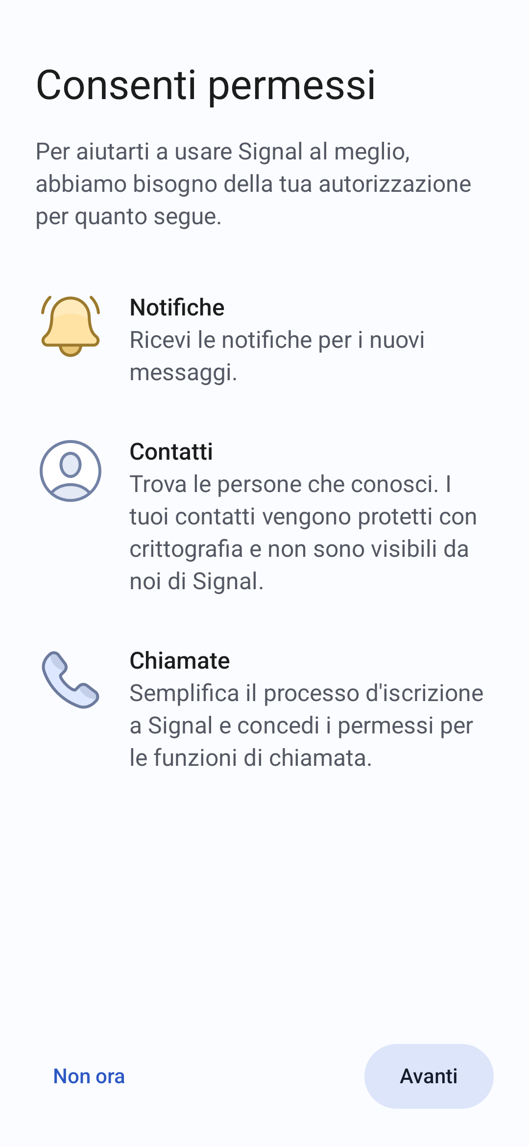 Dopo aver letto i Termini e l'Informativa sulla privacy, tocca Continua. Signal ora ti chiederà le autorizzazioni necessarie, come l'accesso alle notifiche e ai tuoi contatti. Puoi scegliere di non consentire, ma in tal caso non riceverai notifiche per i nuovi messaggi e sarà più difficile trovare le persone che conosci.
