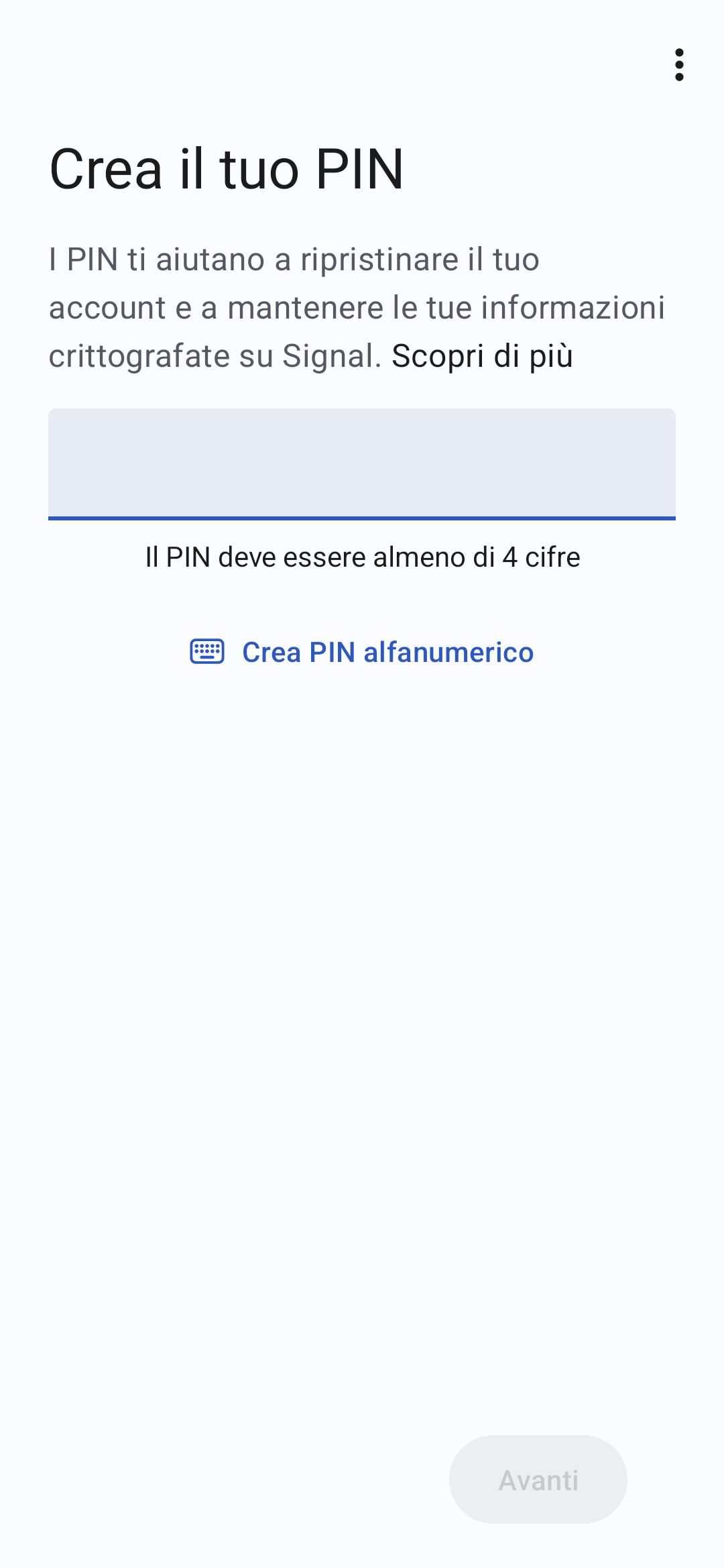 Dopo aver impostato il tuo profilo, tocca Avanti per creare il tuo PIN di Signal. I PIN ti aiutano a recuperare il tuo account e a mantenere le tue informazioni crittografate. Puoi scegliere un PIN numerico o alfanumerico.