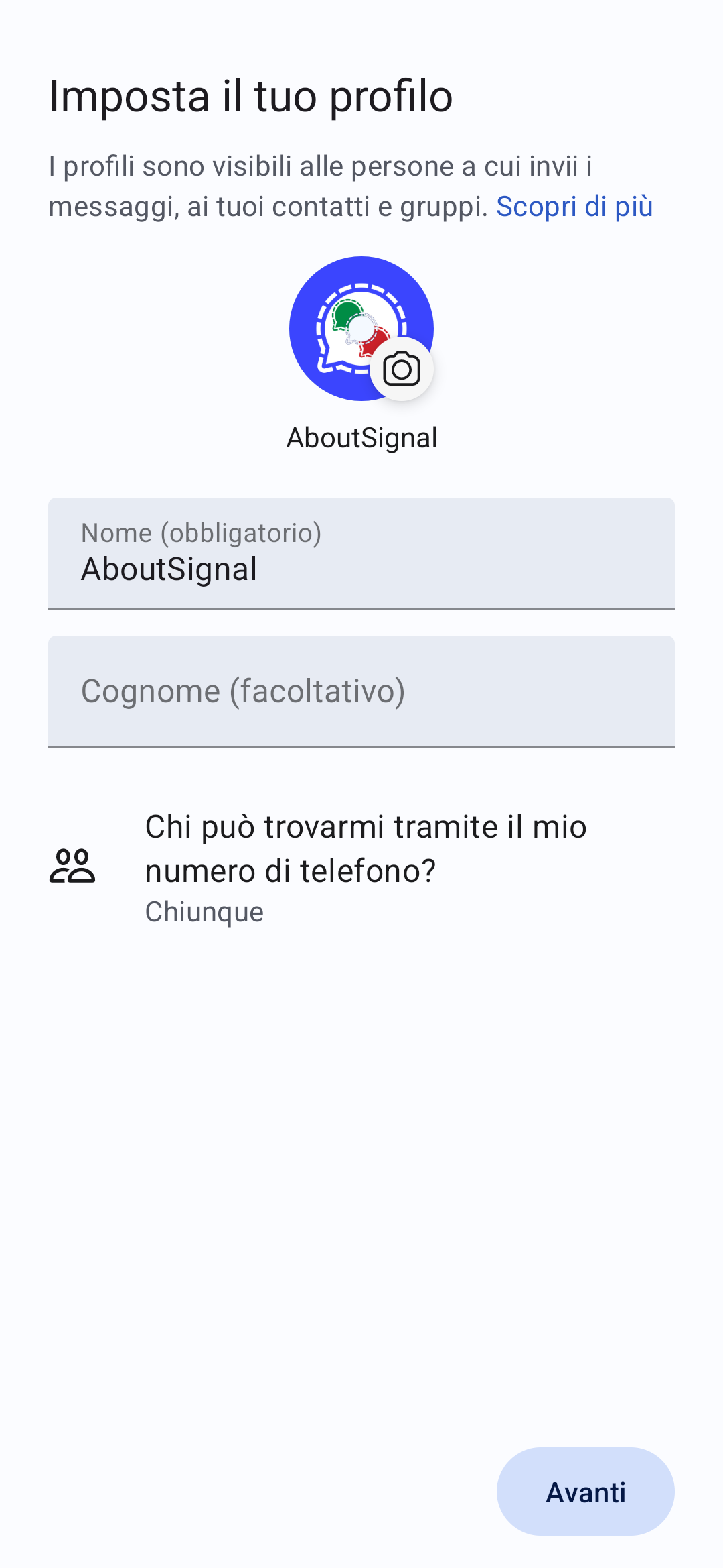 Solo il nome è necessario per il profilo Signal. Non deve essere necessariamente il tuo vero nome, puoi usare qualsiasi nome tu scelga.