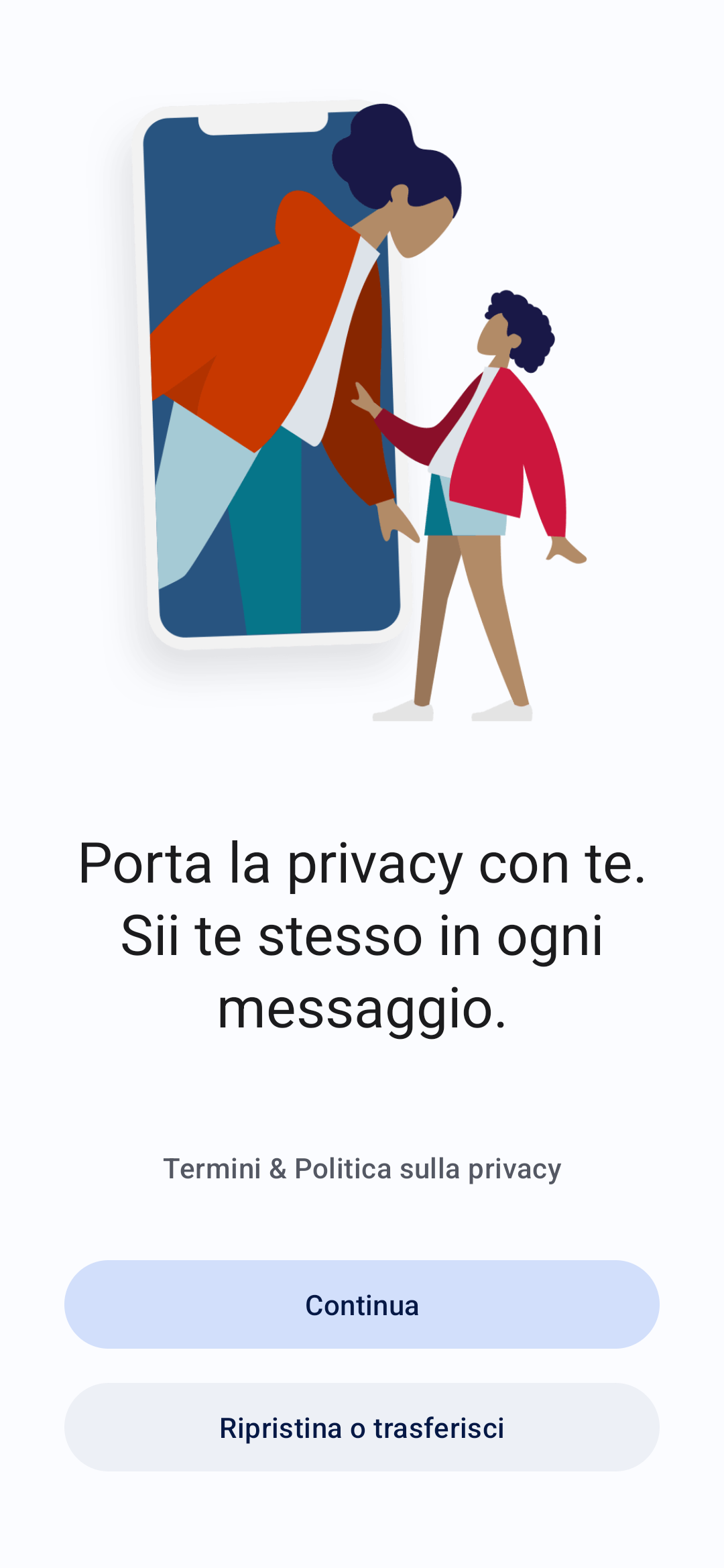 Prima di registrarti e iniziare a utilizzare Signal, è importante leggere i Termini e l'Informativa sulla privacy. Tocca il collegamento Termini e Informativa sulla privacy e poi tocca Continua.