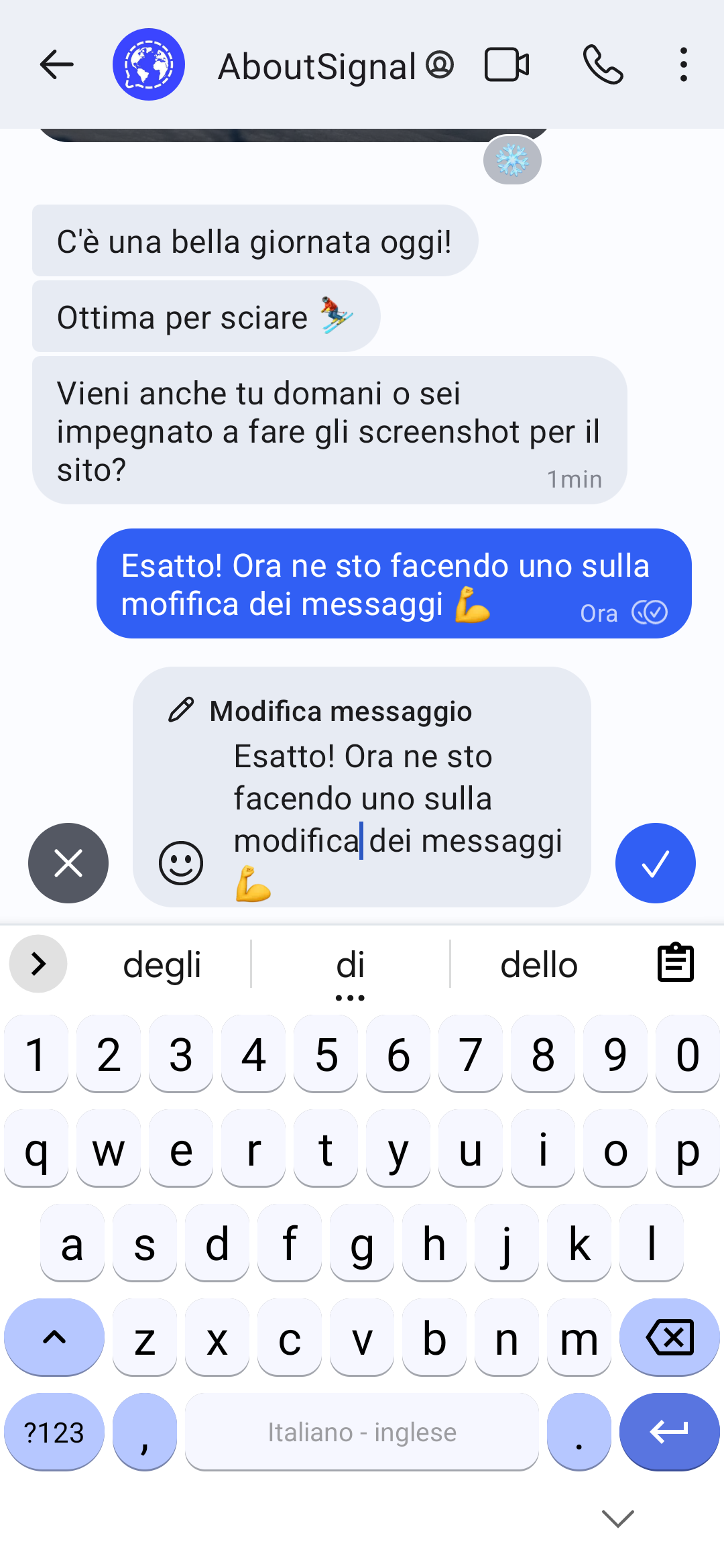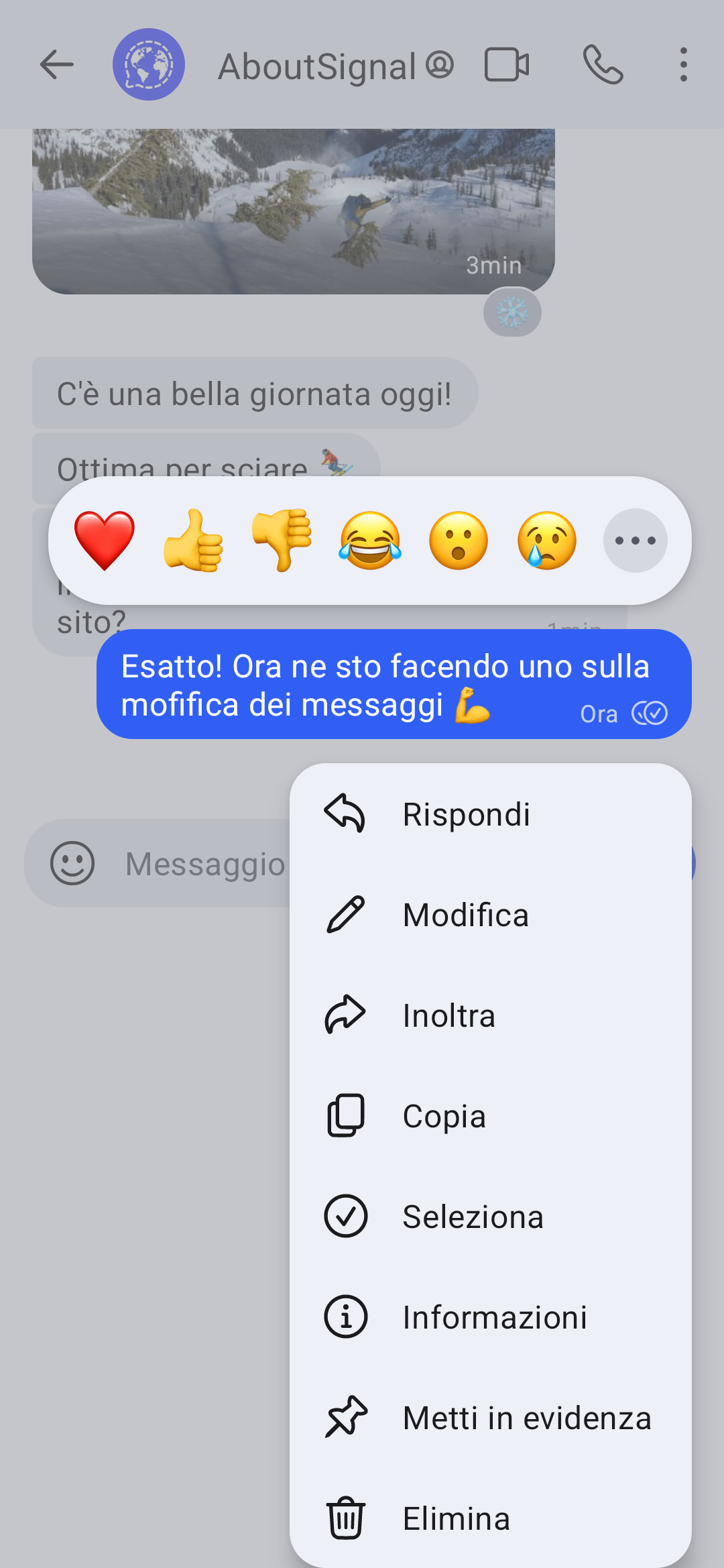 Hai fatto un errore di battitura o vuoi correggere qualcosa nel messaggio inviato? Su Signal, puoi modificare i messaggi inviati entro 24 ore dall'invio, con un massimo di 10 modifiche per messaggio.