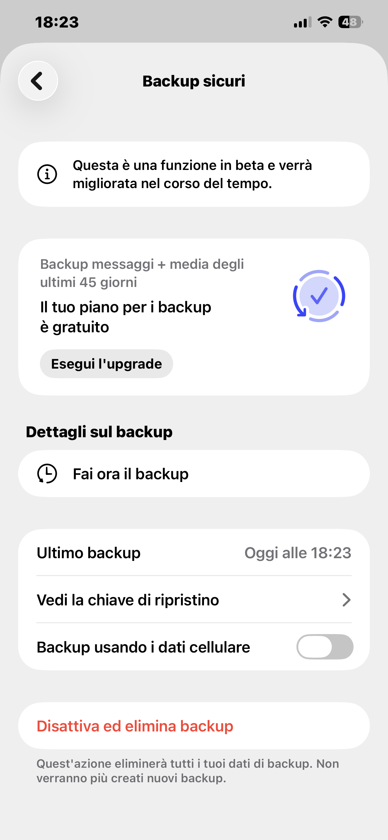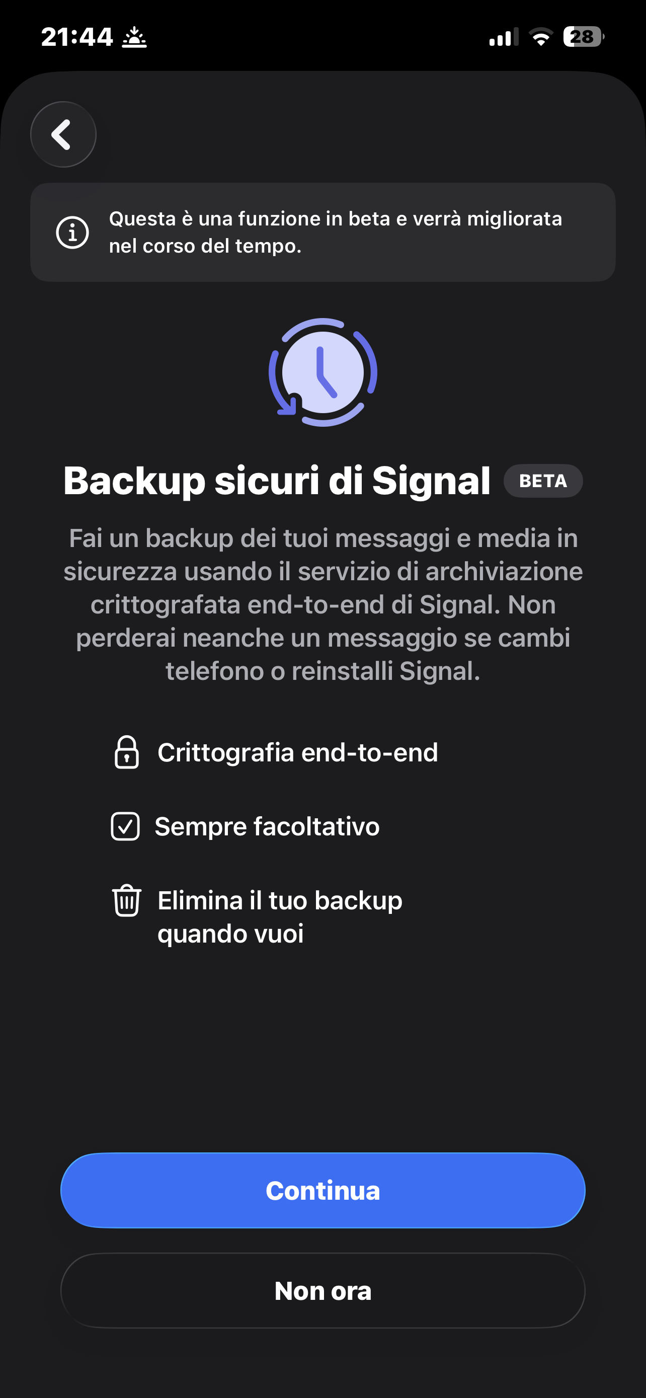 Nell'app Signal, la nuova funzionalità di Backup presenta una piccola etichetta "Beta". Questo è intenzionale, poiché ci sono ancora casi limite che necessitano di ulteriori test e la funzionalità di backup verrà migliorata nel tempo.