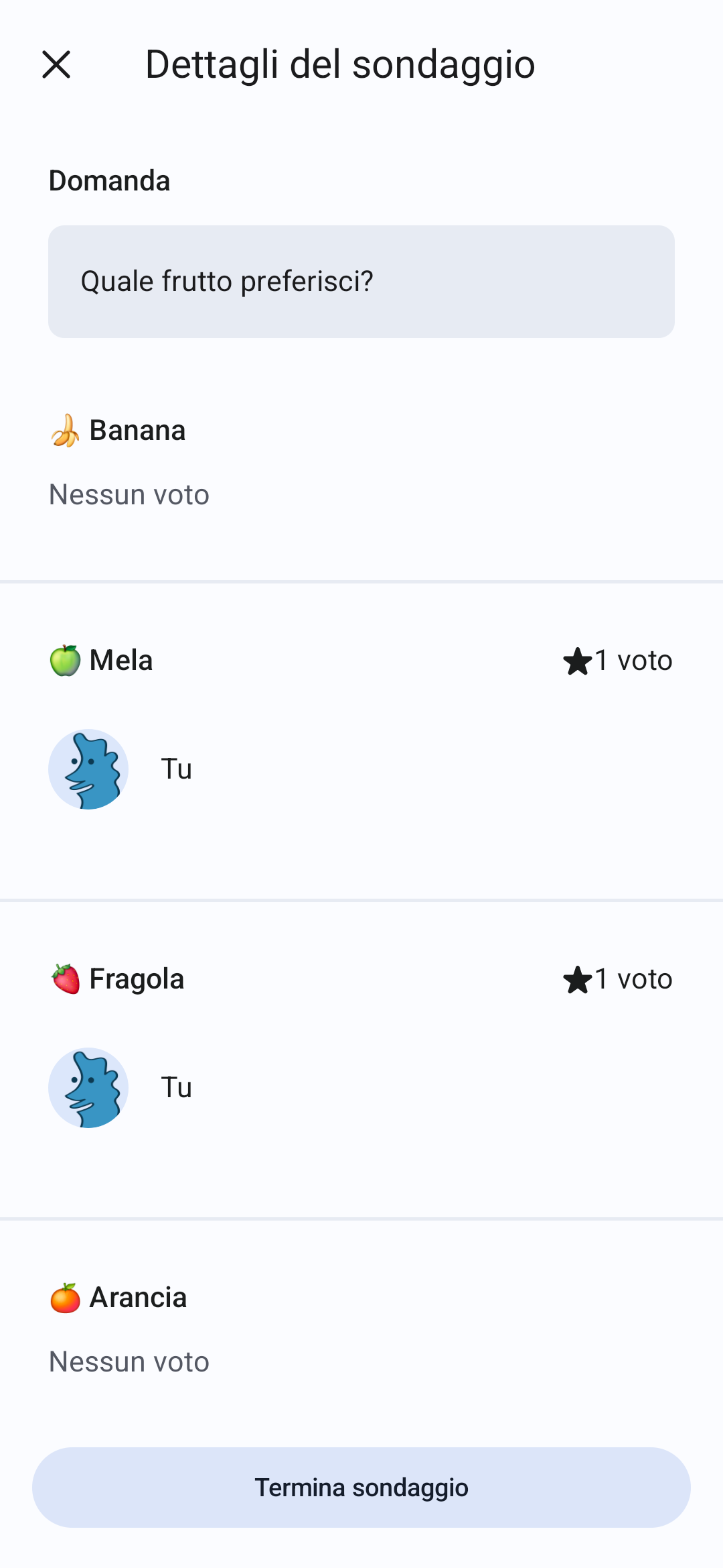 Tutti i membri del gruppo possono visualizzare i voti attuali o i risultati finali del sondaggio toccando il pulsante “Vedi voti” o “Vedi risultati”. Nella schermata dei dettagli del sondaggio è possibile vedere il numero totale di voti per ciascuna opzione e chi ha votato per ogni risposta.
