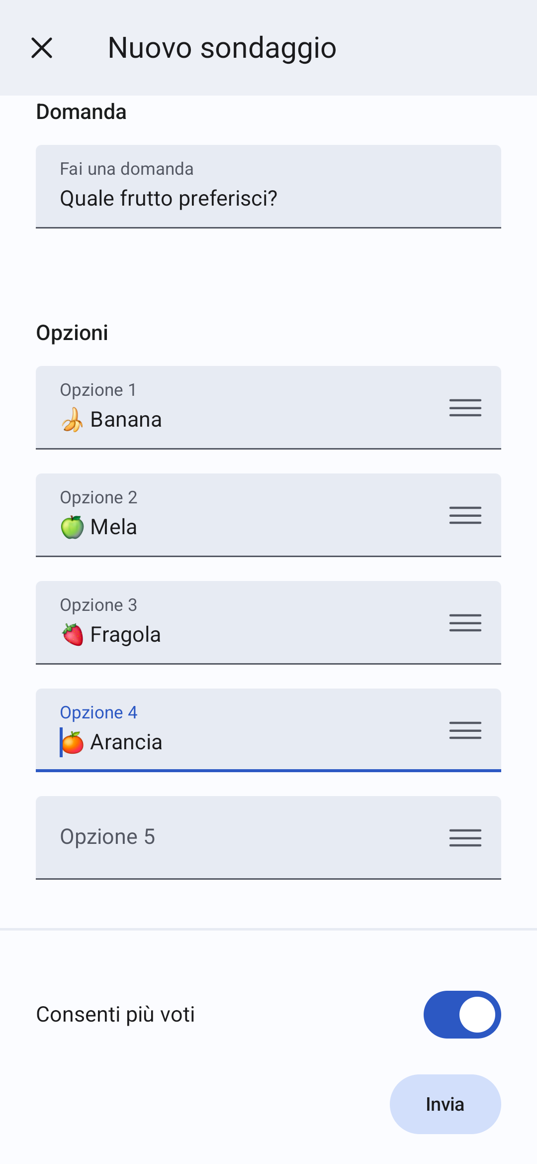 Quando crei un sondaggio, puoi specificare se i partecipanti possono votare una o più opzioni. Questo rende i sondaggi adatti per attività quali pianificare appuntamenti, scegliere cosa mangiare o prendere importanti decisioni di gruppo.