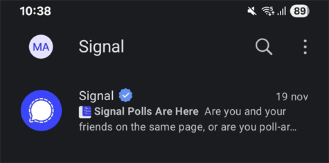 To announce new features, Signal uses its own chat channel, known as the Release Note Channel. In recent weeks, Signal has sent a message here about the new Polls feature.