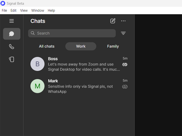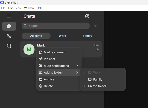 The chat folders feature is currently in beta and will soon be available for everyone on Signal Desktop.