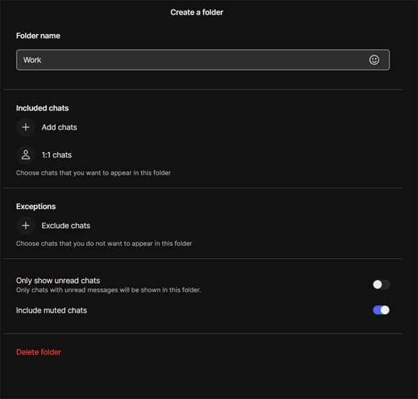 You can also choose to only show unread chats and to include or hide muted chats in your folder: