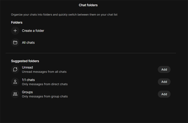 When you create a new folder, you can manually add chats or groups, or choose a chat type (1:1 chats or groups) and exclude certain chats or groups.