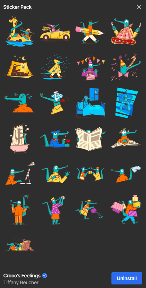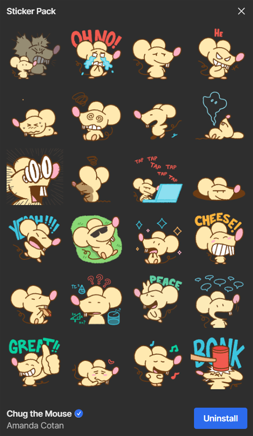 There are three animated sticker packs (Chug the Mouse, Rocky Talk, My Daily Life 2) and two non-animated sticker packs (Cozy Season, Croco’s Feelings).